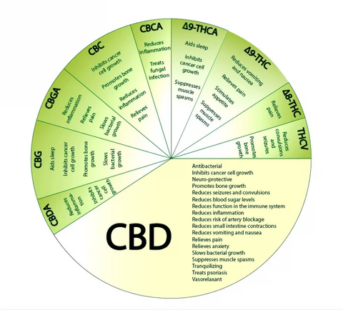 This doesn’t take away from the fact that there are over 100 different cannabinoids in the cannabis plant, all of which function and interact differently within our bodies. The image above is a nice illustration of various health effects that different cannabinoids have on the human body.