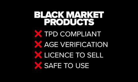 Black market products may be shipped into the UK from abroad meaning the UK regulations are not always safely met. Some markets or stores are selling 5ml tanks, although the UK regulations confirm 2ml capacity tanks should be the maximum amount, to restrict excessive use. In addition some places are selling Non-TPD compliant liquids. This means they are not the legal size, or may contain harmful restricted substances or an extremely high level of nicotine which can be dangerous and highly addictive.