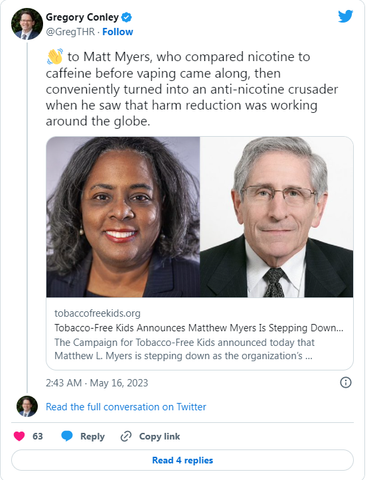 During Myers’ reign, TFK has become a powerful force behind legislation blocking access to non-combustible nicotine products. He has been instrumental in creating a moral panic over teenage Juul use, and has largely coordinated the spread of misinformation that prevents many people who will die from smoking from switching to e-cigarettes.
