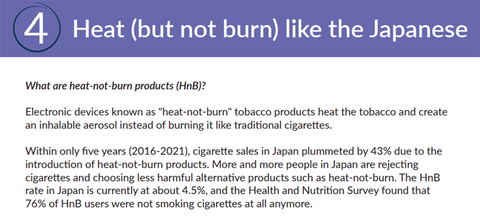 Japan is praised for the popularity of HNB (Heat Not Burn) products, which still use tobacco but do not fully combust them. Instead the tobacco is heated to a lower temperature which still releases the nicotine. Between 2016 and 2021 cigarette sales in Japan plummeted by a staggering 43% due to HNB products!