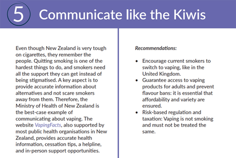 New Zealand gets commended for their communication and their tough stance on tobacco. Plus their Ministry of Health recommend vaping and produce accurate communication such as their website “Vaping Facts“.